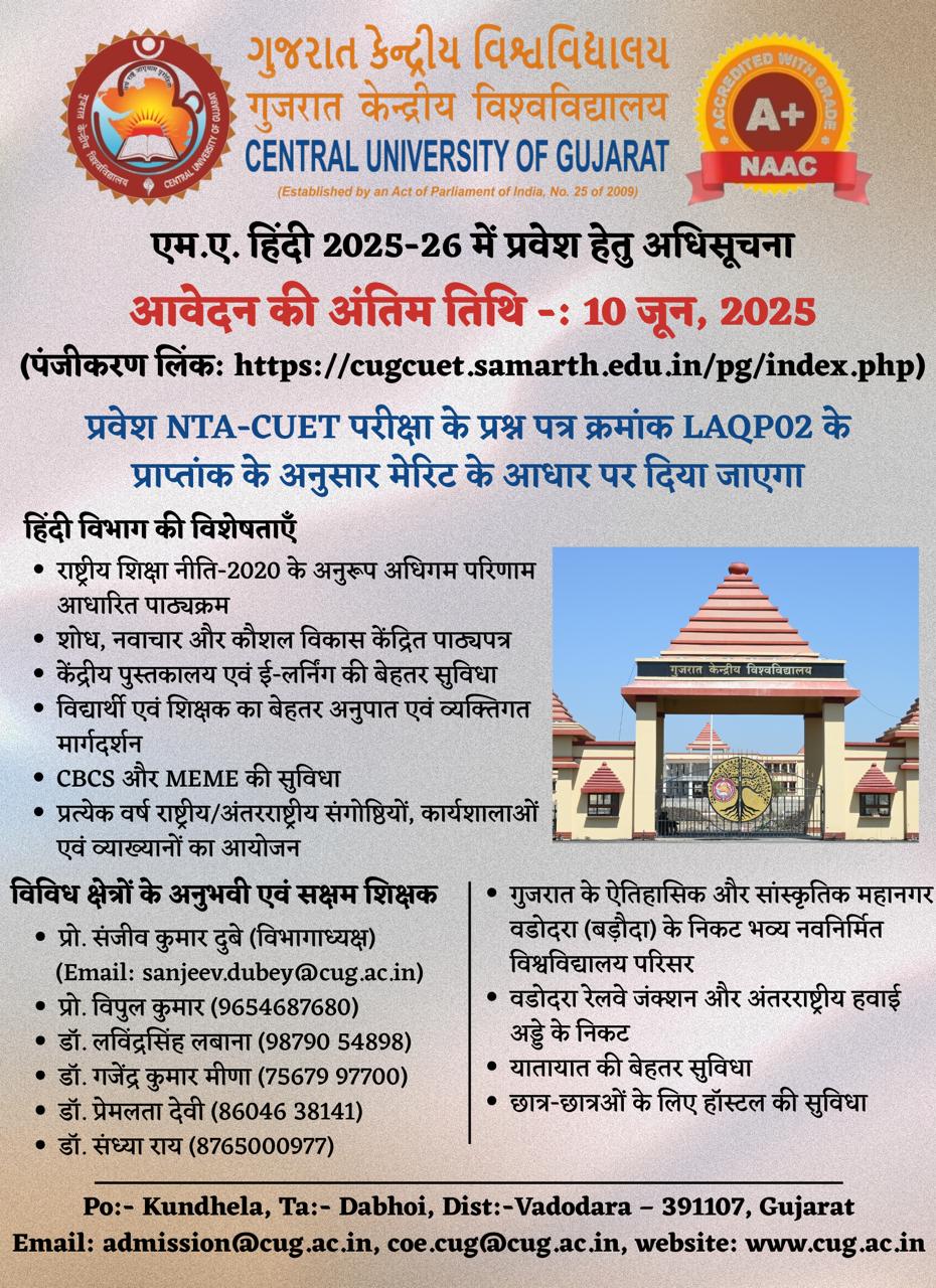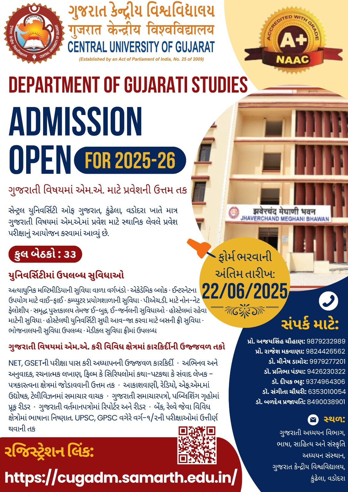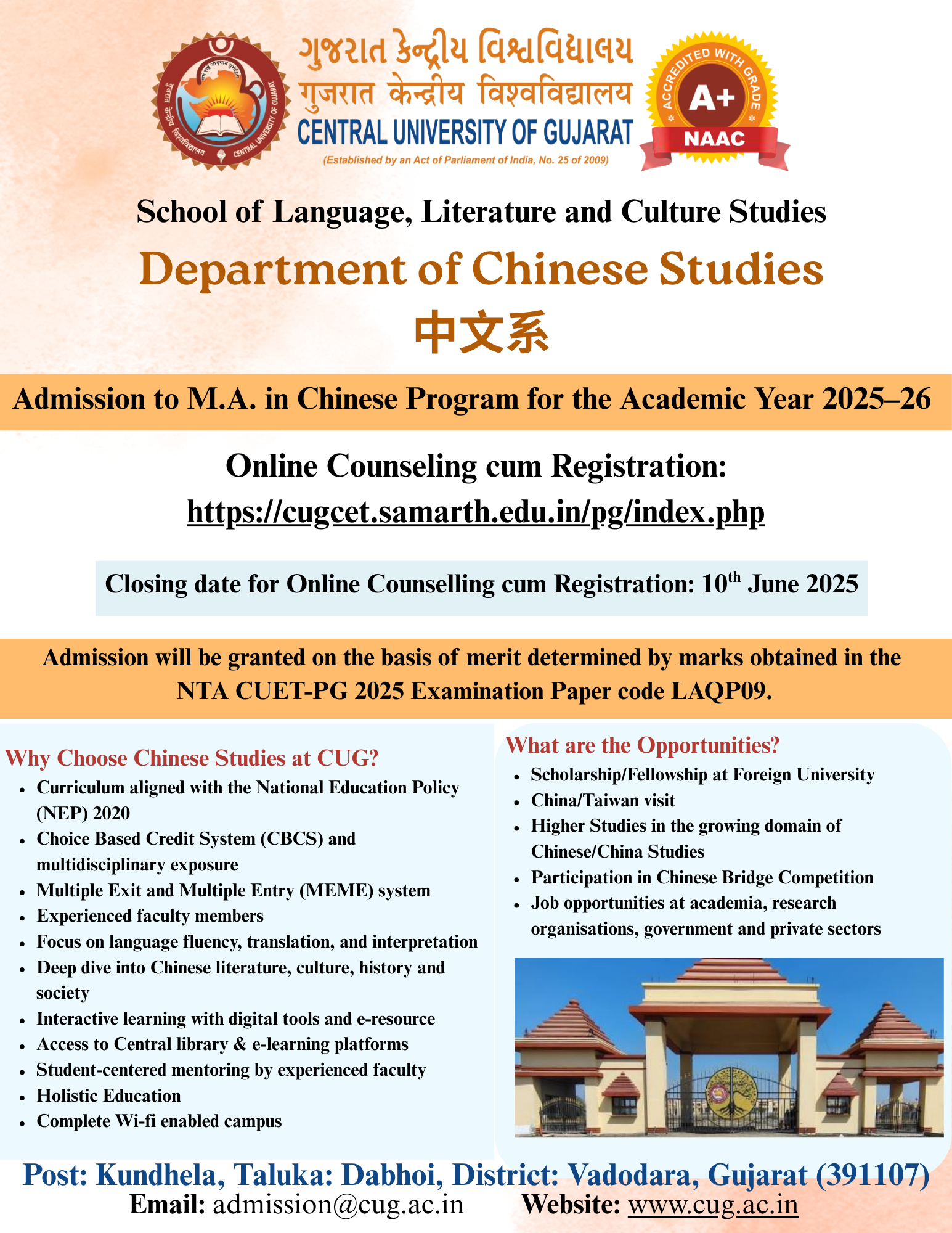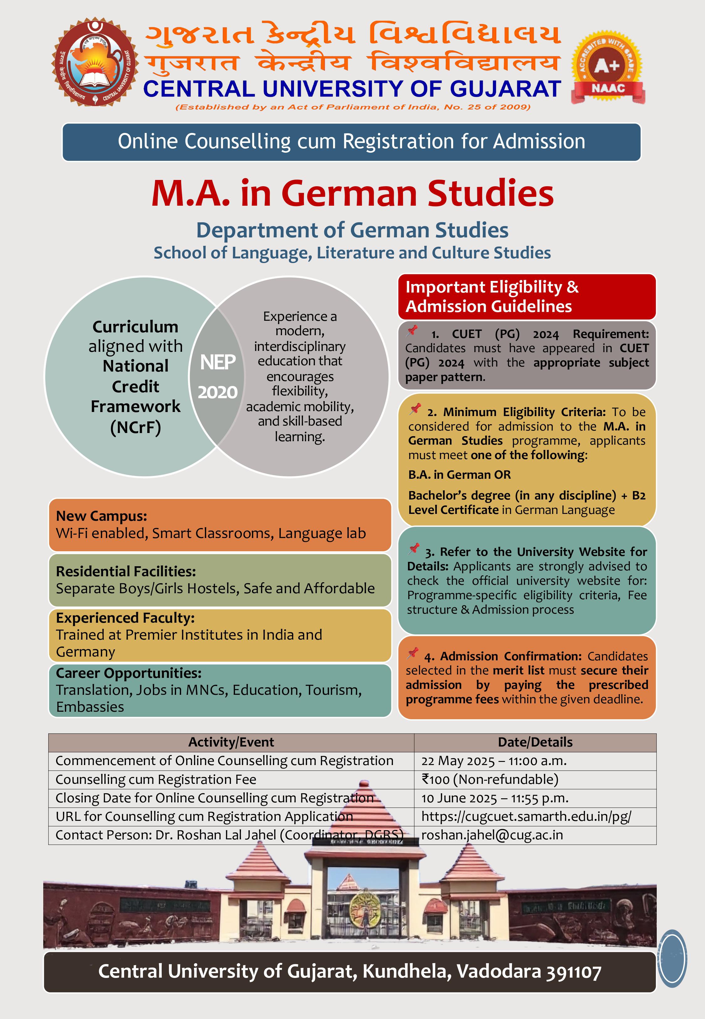 We are happy to inform you that the admission process has started for Academic Year 2025-26 for Undergraduate & Postgraduate programmes of Central University of Gujarat (CUG). The Central University of Gujarat has joined the Common University Entrance Test (CUET) to be conducted by NTA. The CUET will provide a single window opportunity to students to seek admission in any of the Central Universities (CUs) across the country. In this regard, the National Testing Agency has been entrusted with the responsibility of conducting the Undergraduate entrance tests for all the Central Universities (CUs) for the academic session 2025-2026. The list of UG & PG programmes, eligibility criteria and other details are available on university website.