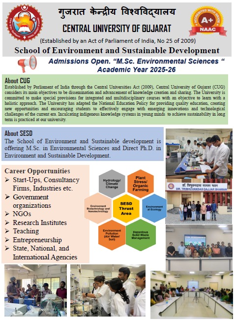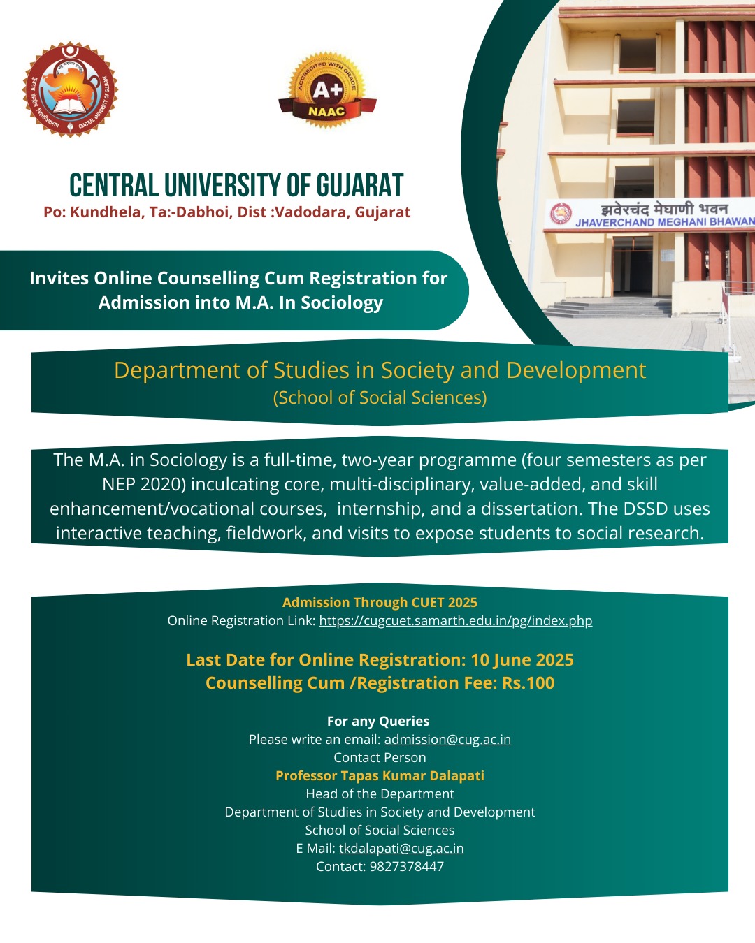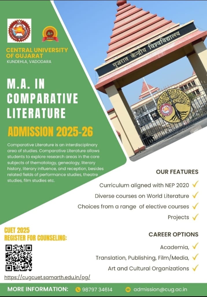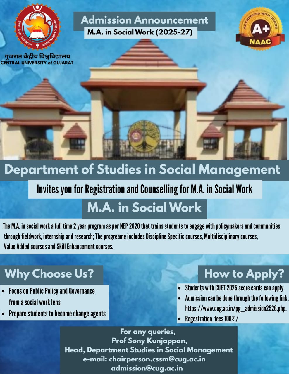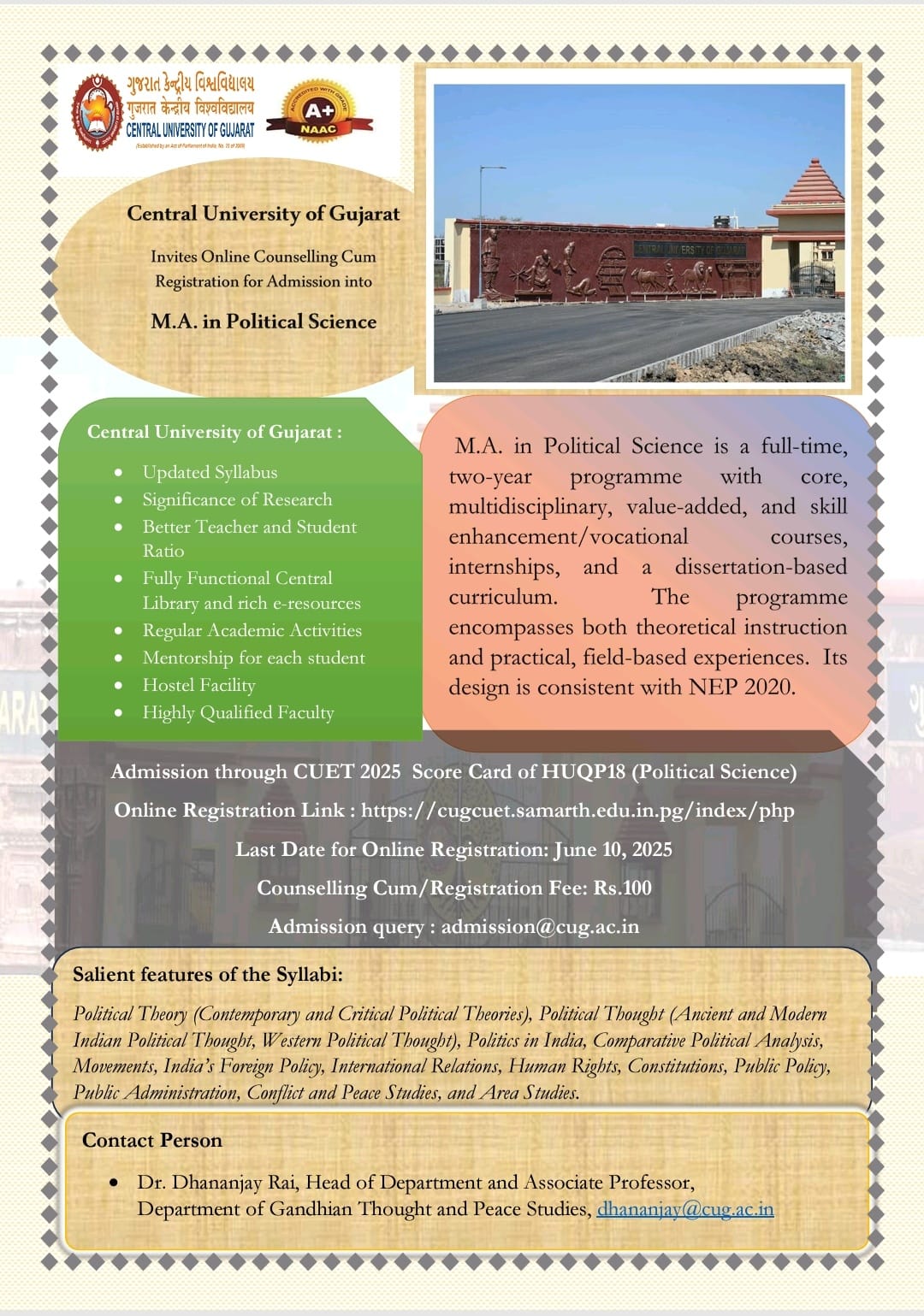 We are happy to inform you that the admission process has started for Academic Year 2025-26 for Undergraduate & Postgraduate programmes of Central University of Gujarat (CUG). The Central University of Gujarat has joined the Common University Entrance Test (CUET) to be conducted by NTA. The CUET will provide a single window opportunity to students to seek admission in any of the Central Universities (CUs) across the country. In this regard, the National Testing Agency has been entrusted with the responsibility of conducting the Undergraduate entrance tests for all the Central Universities (CUs) for the academic session 2025-2026. The list of UG & PG programmes, eligibility criteria and other details are available on university website.