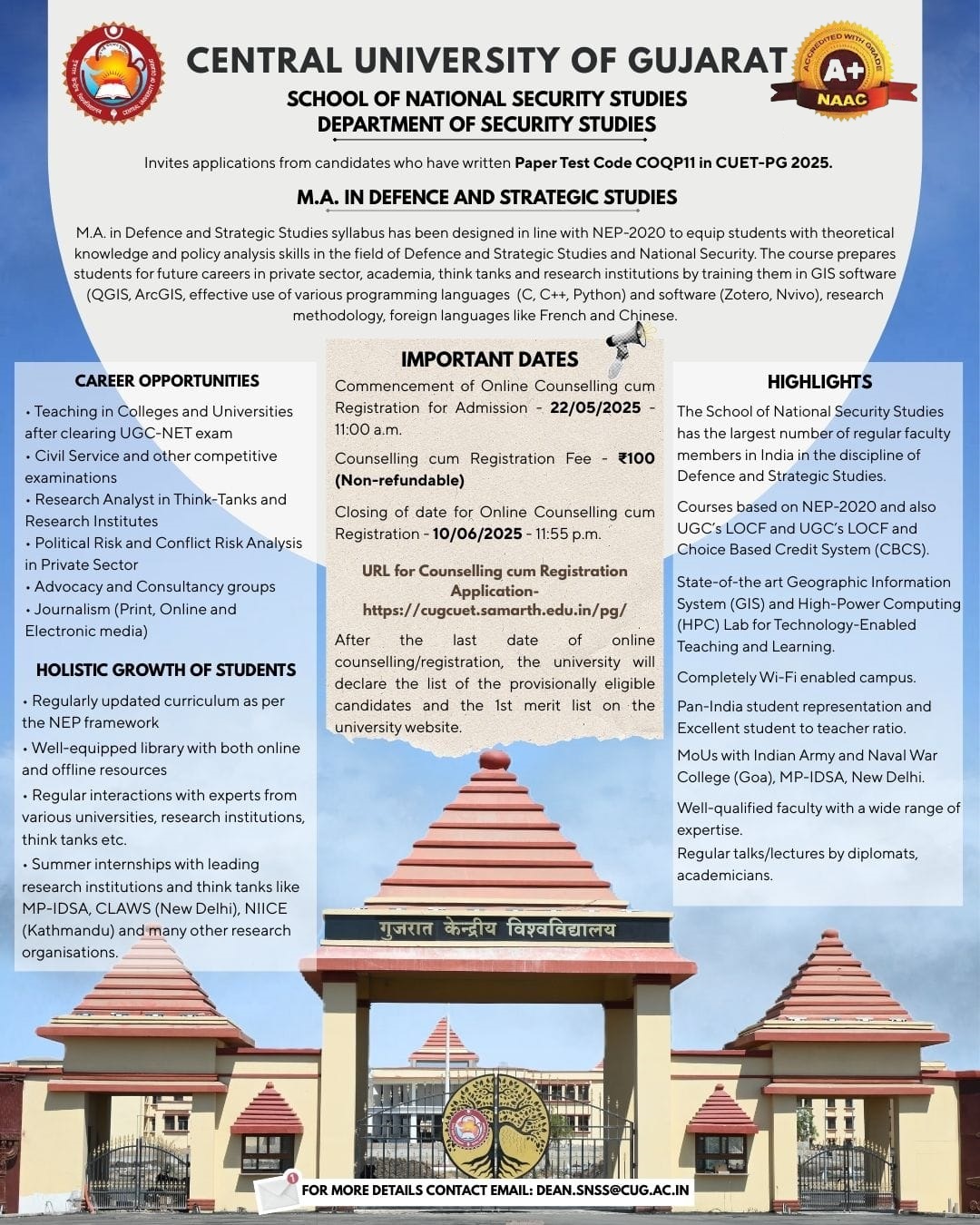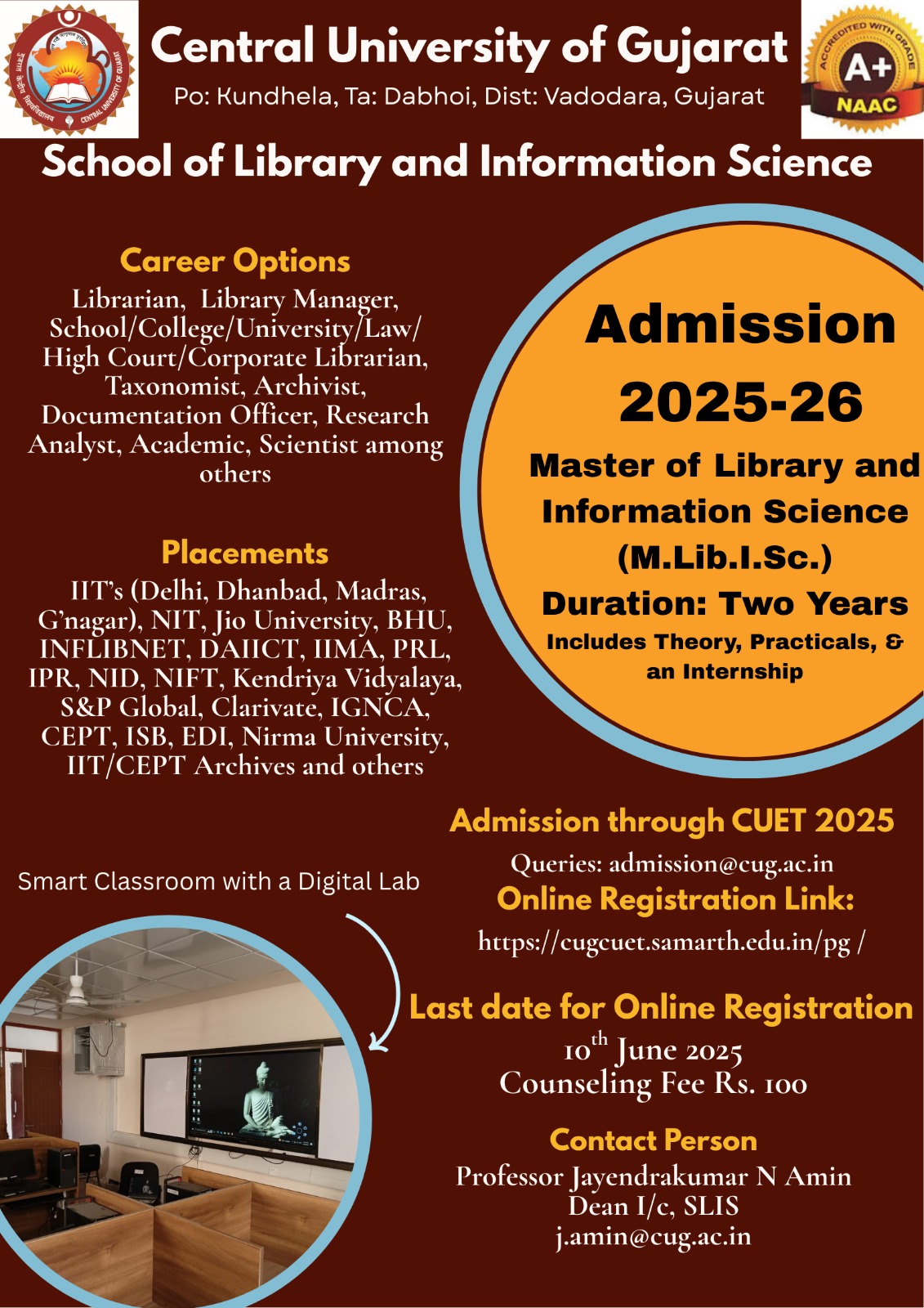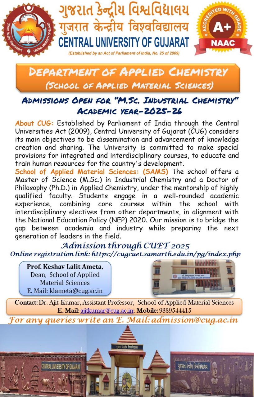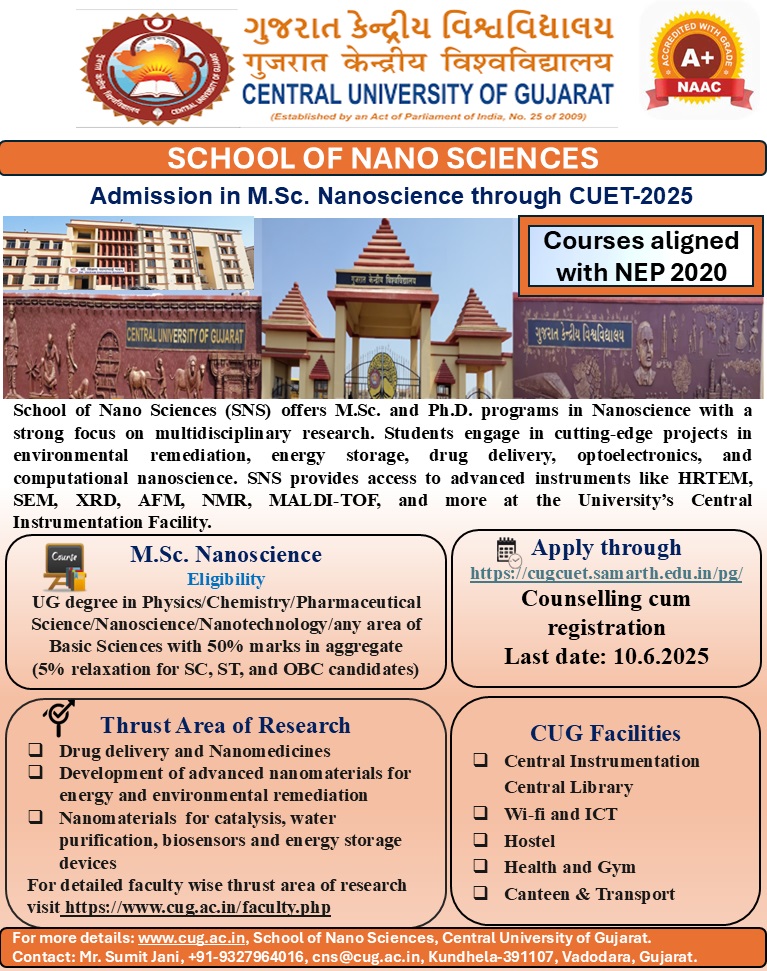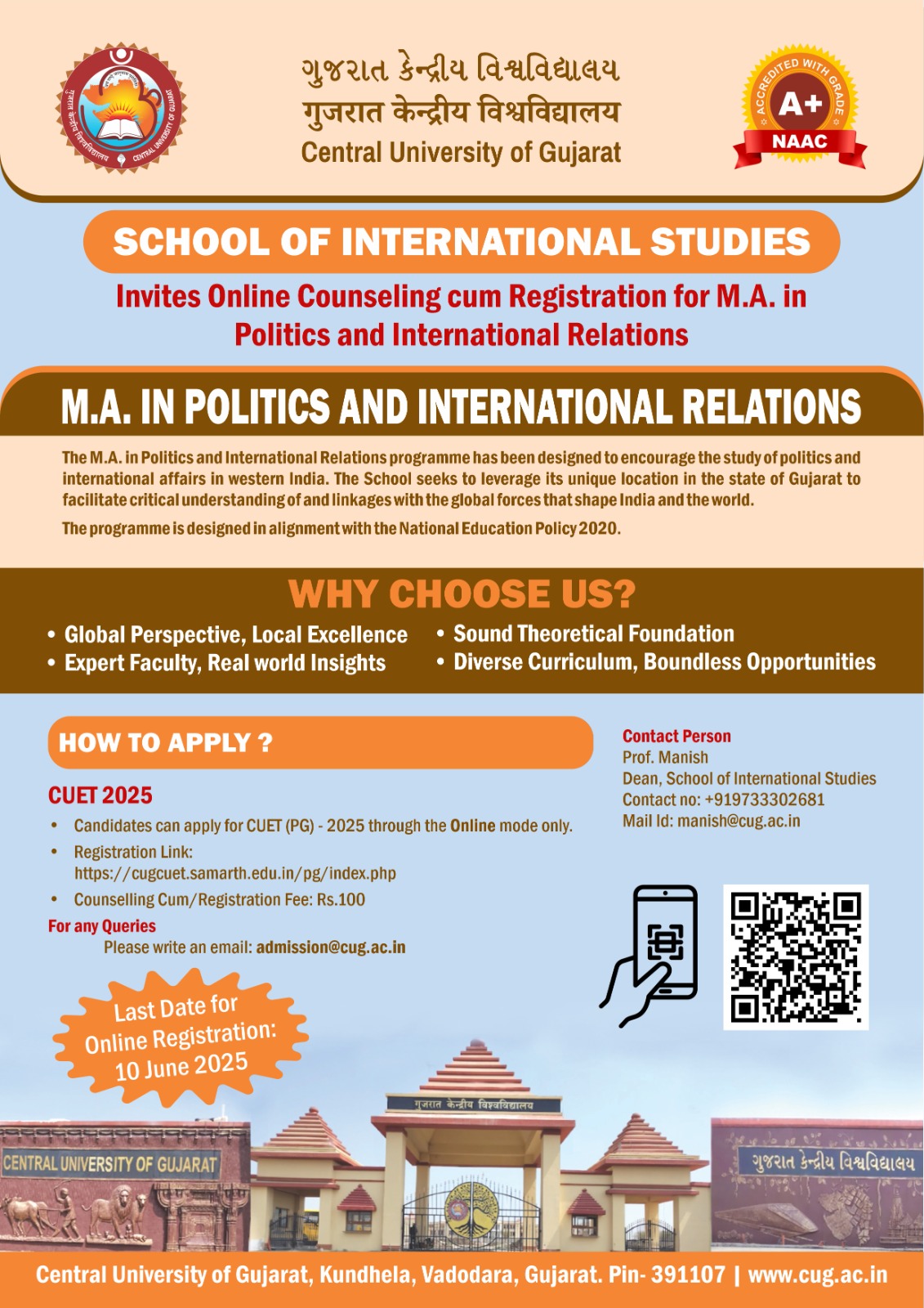 We are happy to inform you that the admission process has started for Academic Year 2025-26 for Undergraduate & Postgraduate programmes of Central University of Gujarat (CUG). The Central University of Gujarat has joined the Common University Entrance Test (CUET) to be conducted by NTA. The CUET will provide a single window opportunity to students to seek admission in any of the Central Universities (CUs) across the country. In this regard, the National Testing Agency has been entrusted with the responsibility of conducting the Undergraduate entrance tests for all the Central Universities (CUs) for the academic session 2025-2026. The list of UG & PG programmes, eligibility criteria and other details are available on university website.